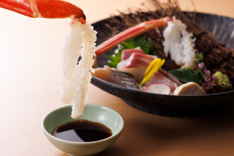 まるごと一杯の蟹の姿盛りのほか、蟹刺しや焼蟹、蟹釜飯、蟹鍋などを満喫できます。